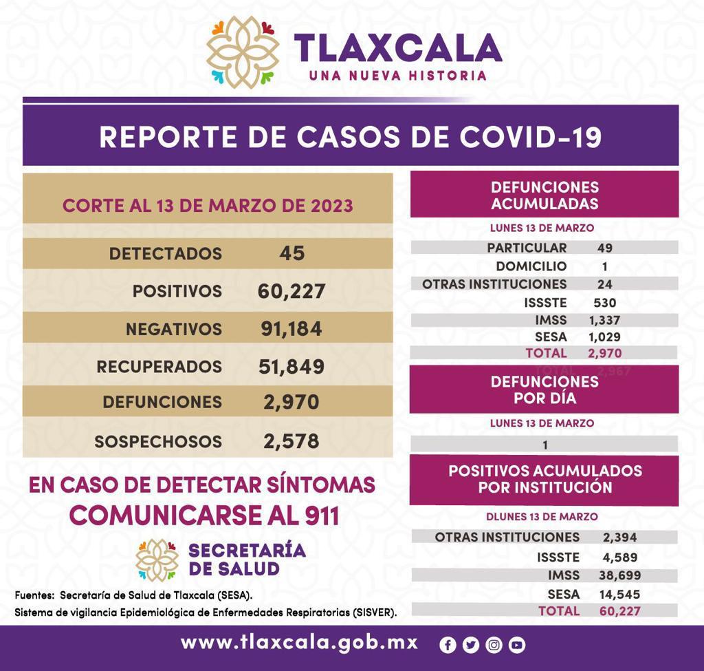 Los datos registrados en la plataforma nacional del Sistema de Vigilancia Epidemiológica de Enfermedades Respiratorias (Sisver), confirmaron 45 casos positivos de Covid-19 y una defunción, el 13 de marzo de 2023 en la entidad.