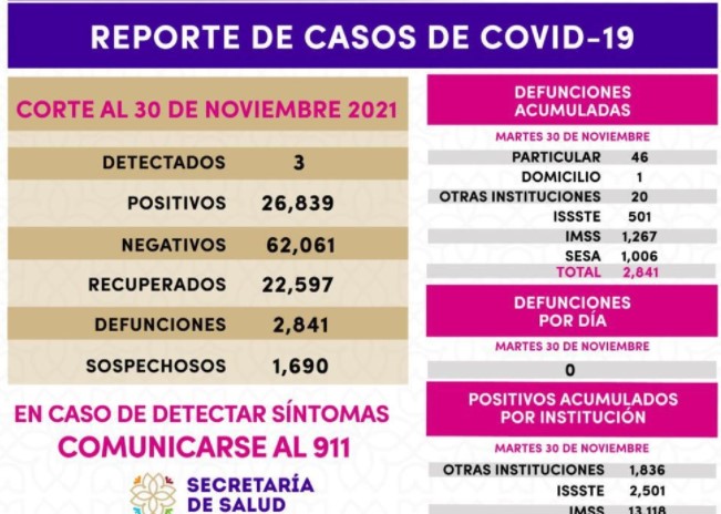 Los datos de la Secretaría de Salud (Sesa) registrados en la plataforma nacional del Sistema de Vigilancia Epidemiológica de Enfermedades Respiratorias (Sisver), confirmaron tres casos positivos de Covid–19 y cero defunciones el 30 de noviembre de 2021 en la entidad.