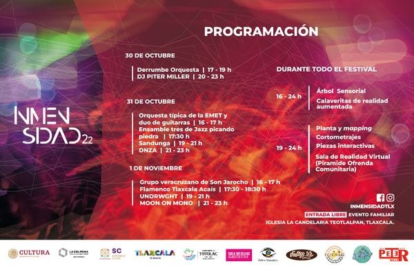 Las secretarías de Cultura de Tlaxcala y del gobierno de México, a través de La Colmena: Centro de Tecnologías Creativas “Grace Quintanilla” y el colectivo Rosa Mejicano, invitan al Festival Cultural Inmensidad, que se realizará los días 30, 31 de octubre y 1 de noviembre, en el panteón de La Candelaria Teotlalpan, Tlaxcala, en un horario de 16:00 a las 24:00 horas.