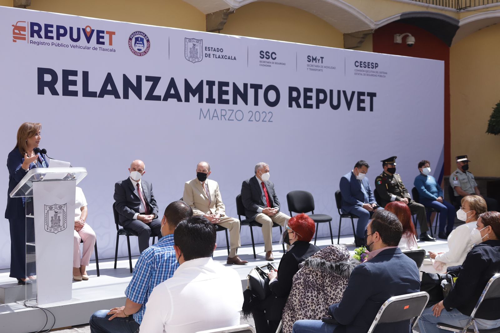 La gobernadora del estado encabezó el relanzamiento del programa del Registro Público Vehicular de Tlaxcala (Repuvet), con el objetivo de utilizar la tecnología como una herramienta de seguridad que permita abatir el robo de vehículos, además de que es un programa de cobertura nacional que identifica y certifica sin costo la posesión legal de un automóvil.
