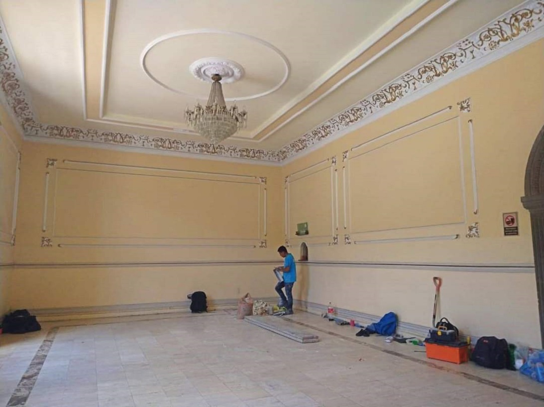 Los trabajos de remozamiento del histórico inmueble comprenden pintura, colocación de tableros, pisos laminado y vinílico, así como policarbonato en el domo del recinto, un tratamiento anti-polillas a la viguería y la renovación de varias butacas.