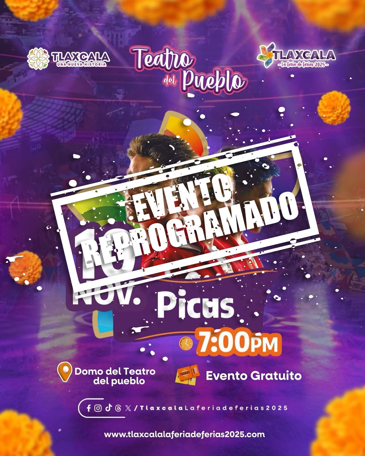 El Patronato para las Exposiciones y Ferias en la Ciudad de Tlaxcala informó que, debido a las condiciones climáticas adversas y los fuertes vientos registrados en las últimas horas por la entrada del frente frío número 13, el concierto del grupo “Picus”, programado para realizarse este lunes 10 de noviembre en el Teatro del Pueblo de “Tlaxcala, la Feria de Ferias 2025”, será reagendado.