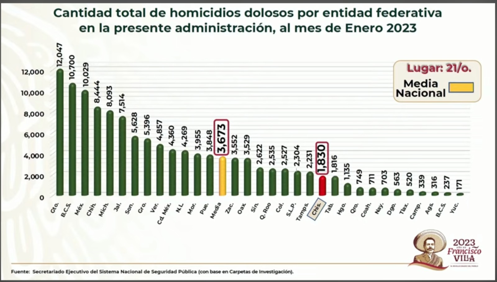 Destacó que la entidad, al igual que Campeche, Aguascalientes, Baja California Sur y Yucatán registran los números más bajos en homicidios dolosos. En contraparte, Guanajuato está por arriba de la media nacional con 12 mil 47 muertes.