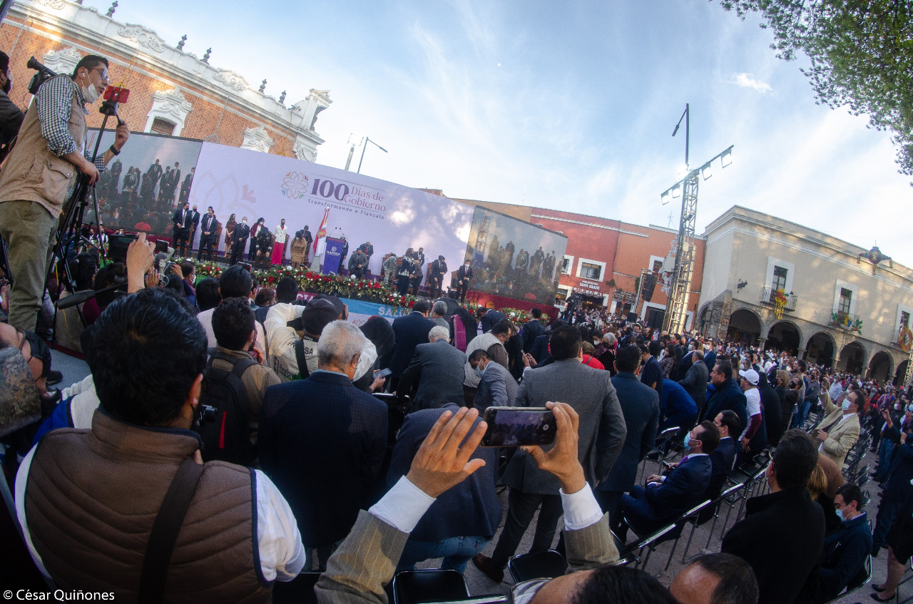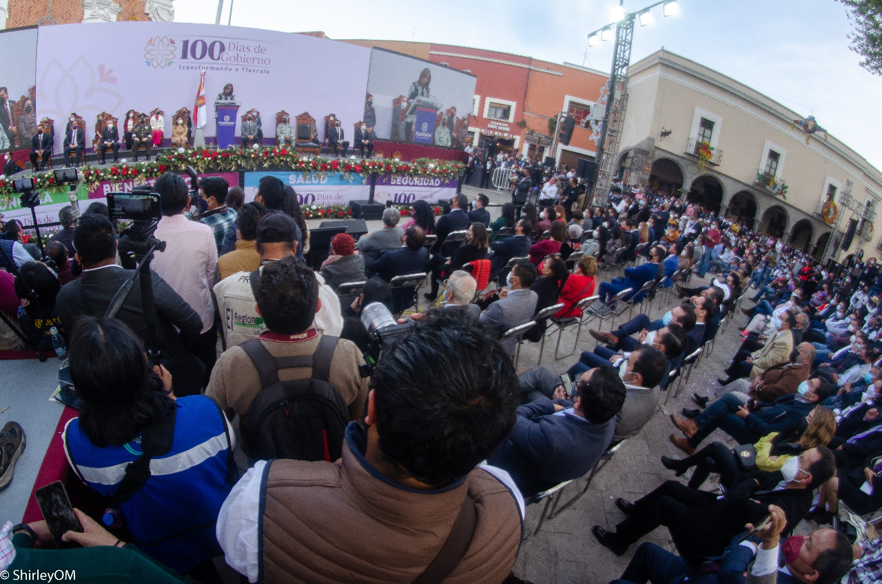 Ante miles de personas que abarrotaron las calles adyacentes y los andadores del zócalo, la gobernadora de Tlaxcala, Lorena Cuéllar Cisneros, rindió este lunes en la explanada del Palacio de Gobierno el informe de los primeros cien días de su gobierno.