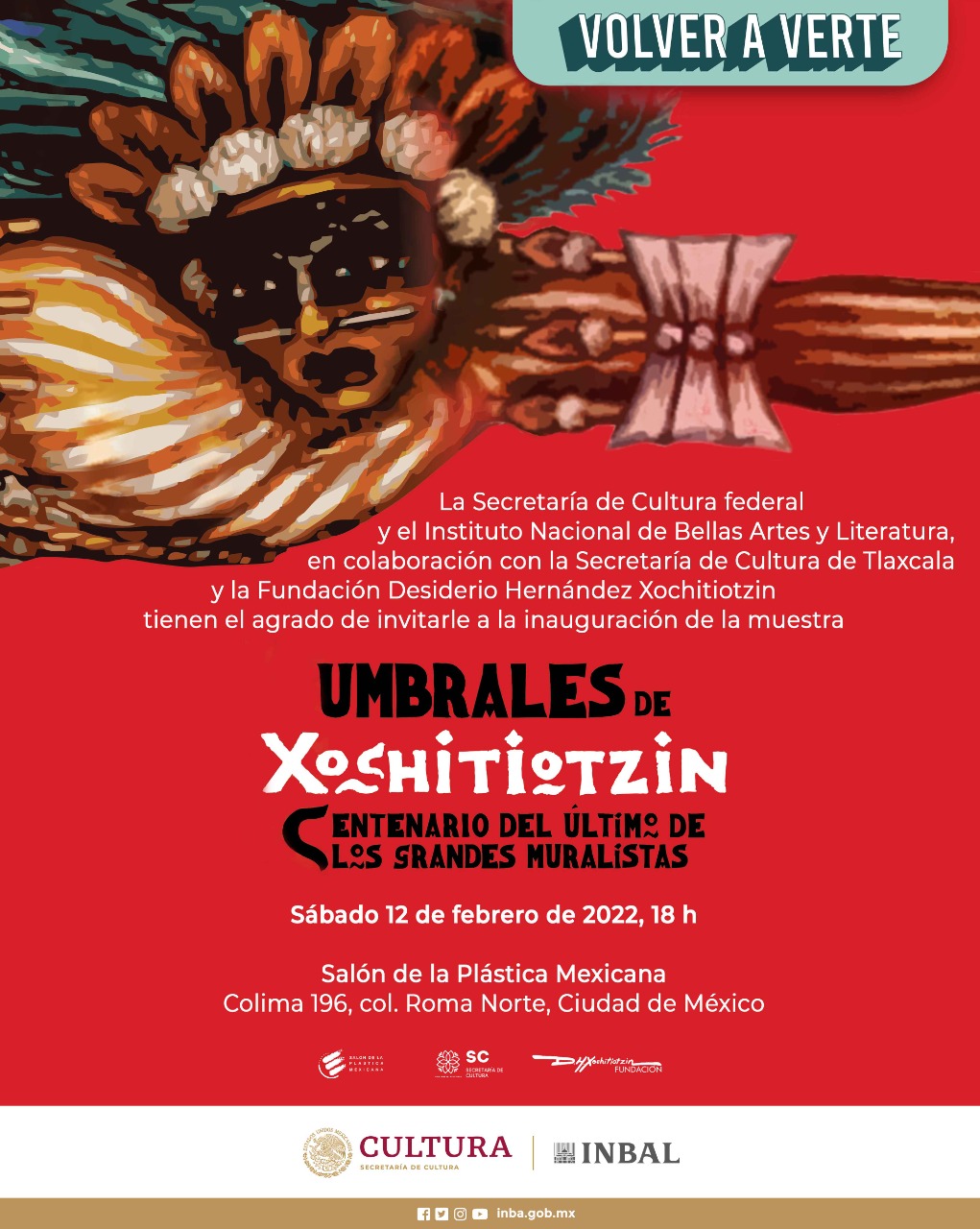 “Umbrales de Xochitiotzin. Centenario del último de los grandes muralistas de México” se inaugura este sábado 12 de febrero a las 18:00 horas en el Salón de la Plástica Mexicana, ubicado en Colima 196, colonia Roma Norte, Ciudad de México, y se podrá visitar a partir del domingo 13, de martes a domingo, de 11:00 a 17:00 horas, hasta el 27 de marzo. La entrada es libre.