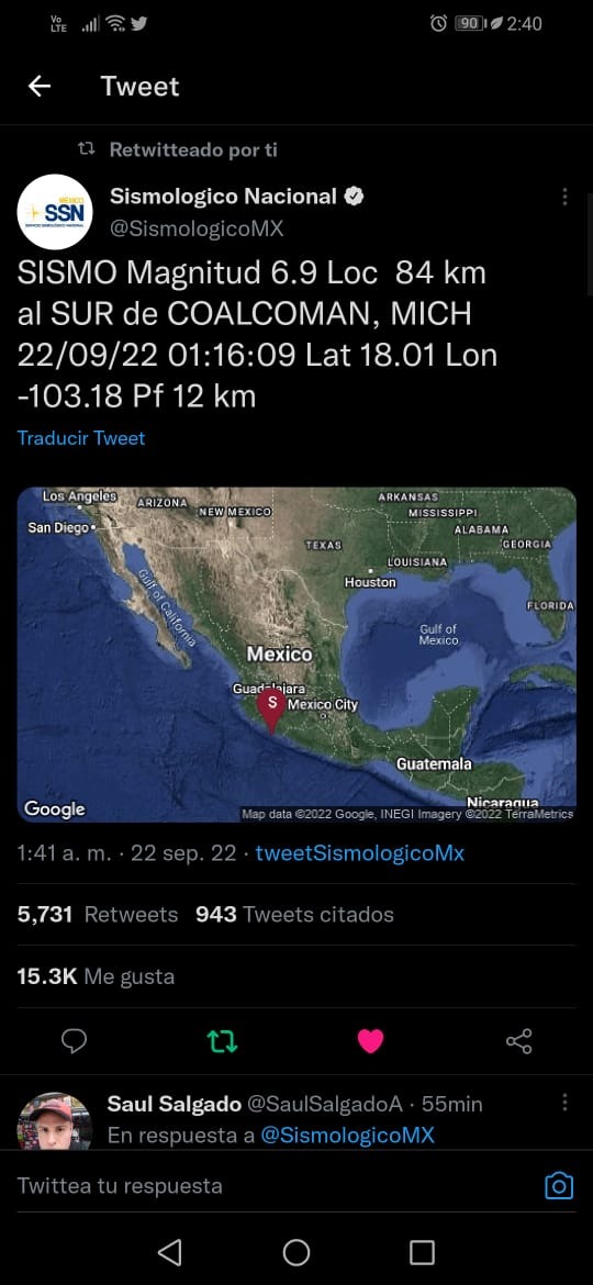 El Servicio Sismológico Nacional registró a las 01:16 horas de este jueves un sismo de magnitud 6.9 que se localizó a 84 kilómetros al sur de Coalcoman en el estado de Michoacán, por lo que la Coordinación Estatal de Protección Civil (CEPC) activó el protocolo y se encuentra en recorrido para verificar inmuebles, escuelas y templos religiosos.