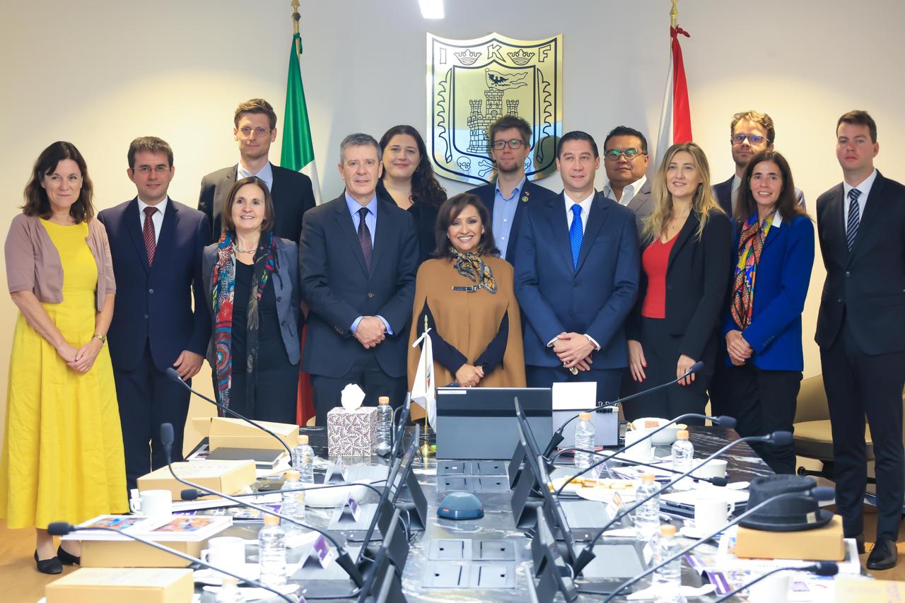 La gobernadora de Tlaxcala, Lorena Cuéllar Cisneros, se reunió con integrantes de la delegación de la Unión Europea en México, acompañada por el Secretario de Desarrollo Económico (Sedeco), Javier Marroquín Calderón y otros miembros del gabinete.
