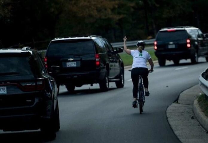 Juli Briskman, de 50 años, perdió su empleo en la empresa Akima luego de ser captada por un fotógrafo de prensa realizando el gesto del dedo medio levantado al paso de la caravana que trasladaba al mandatario estadunidense a su campo de golf en Virginia el mes pasado, reporta The Washington Post.