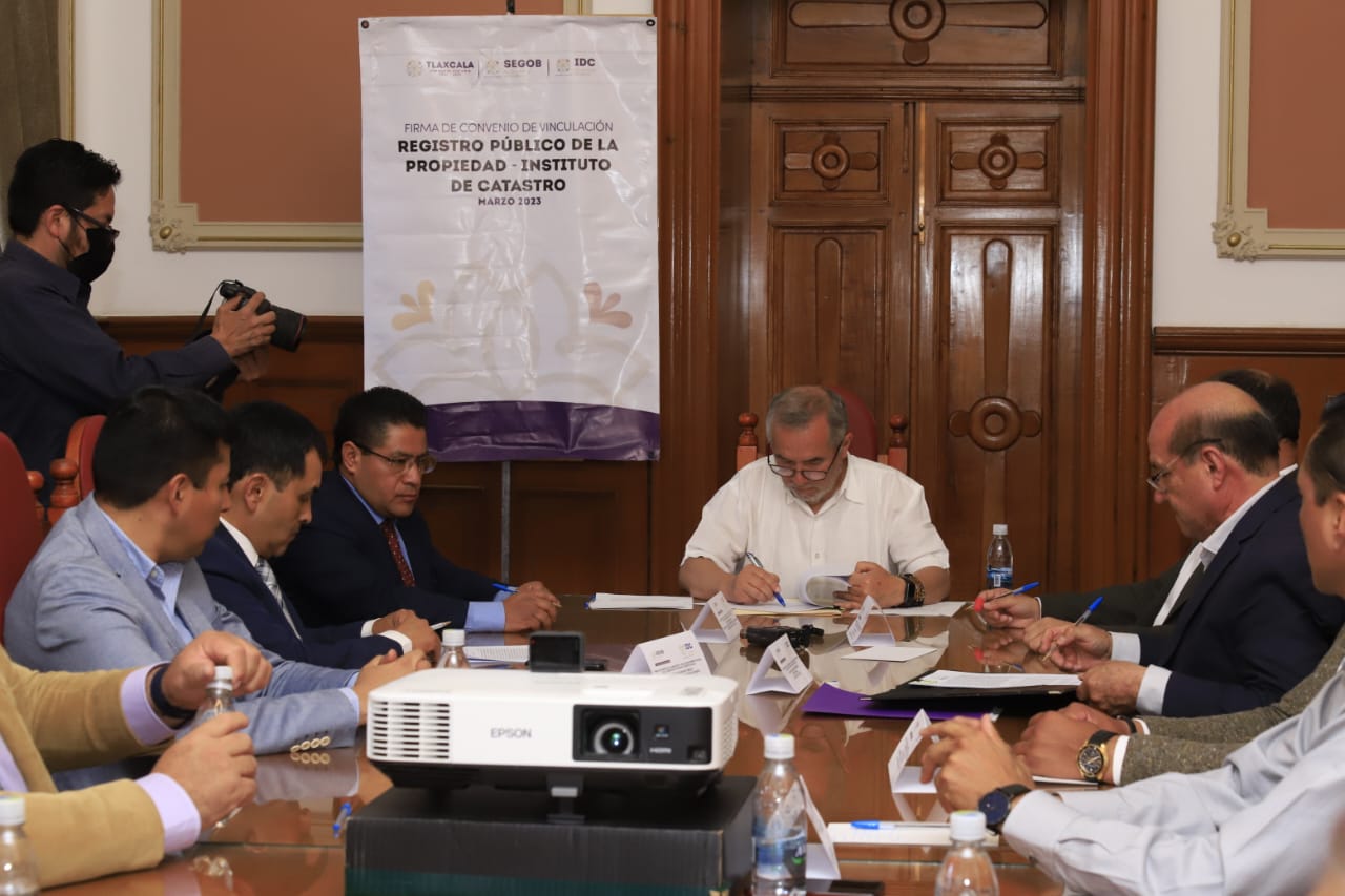El titular de la Secretaría de Gobierno (Segob), Sergio González Hernández encabezó la firma del convenio de colaboración y vinculación interinstitucional entre el Registro Público de la Propiedad y el Instituto de Catastro del Estado (IDC).