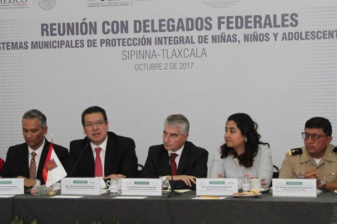 En la reunión con delegados federales para los trabajos del Sistema Nacional de Protección Integral de Niñas, Niños y Adolescentes estuvieron Ricardo Antonio Bucio Mújica, Secretario Ejecutivo del Sipinna; Anabel Alvarado Varela, Secretaria de Gobierno; Lenin Calva Pérez, Secretario de Políticas Públicas y Participación Ciudadana, y Patricia López Aldave, titular del Consejo Estatal de Población y Secretaria Ejecutiva del Sipinna en Tlaxcala, así como delegados federales.