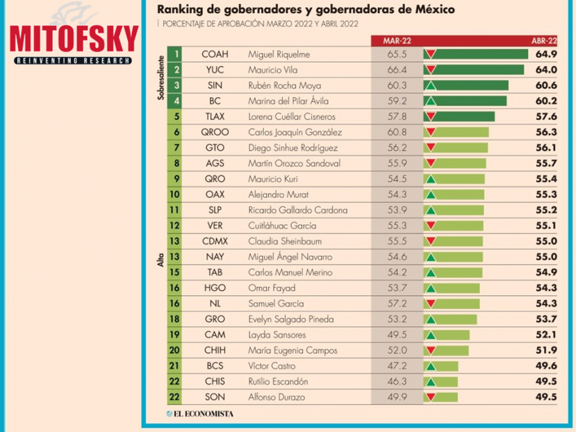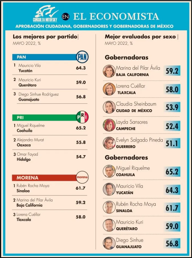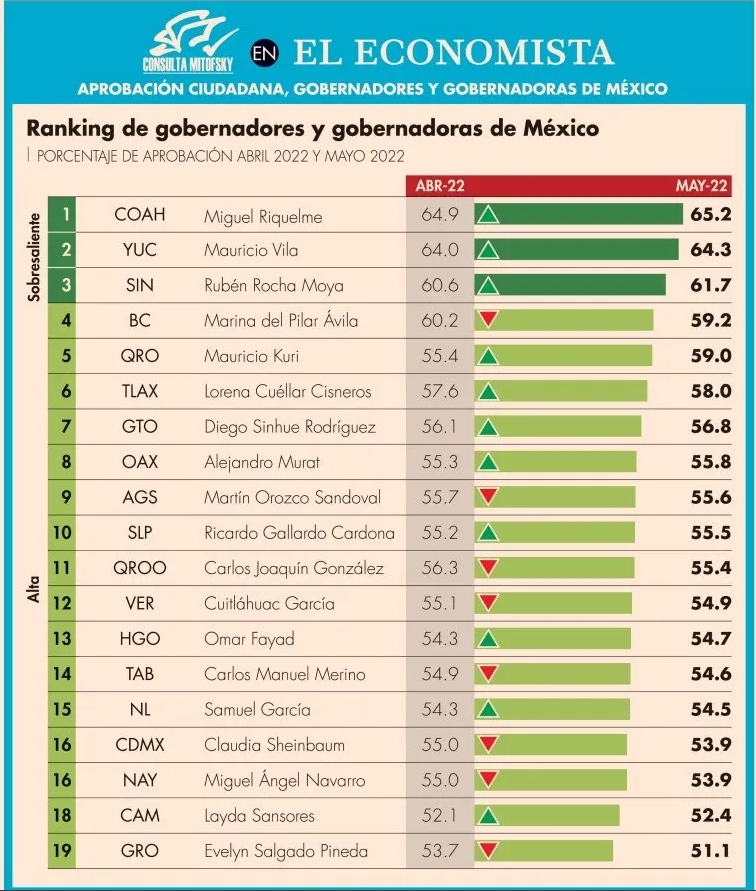 El ranking lo encabezan el priista Miguel Riquelme, de Coahuila, con 65.2%; el panista yucateco Mauricio Vilas con 64.3; y el morenista sinaloense Rubén Rocha con 61.7.