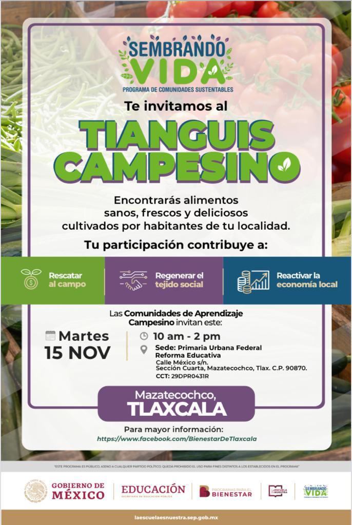 Este evento tiene la finalidad de mostrar a los directivos, maestros, padres de familia y alumnos los productos que se siembran y transforman por parte del programa Sembrado Vida. En este Tianguis, podrán comercializar los granos, hortalizas, frutas y productos preparados que son cultivados con técnicas agrosustentables por las Comunidades de Aprendizaje Campesino (CACs) de Mazatecochco y localidades cercanas.
