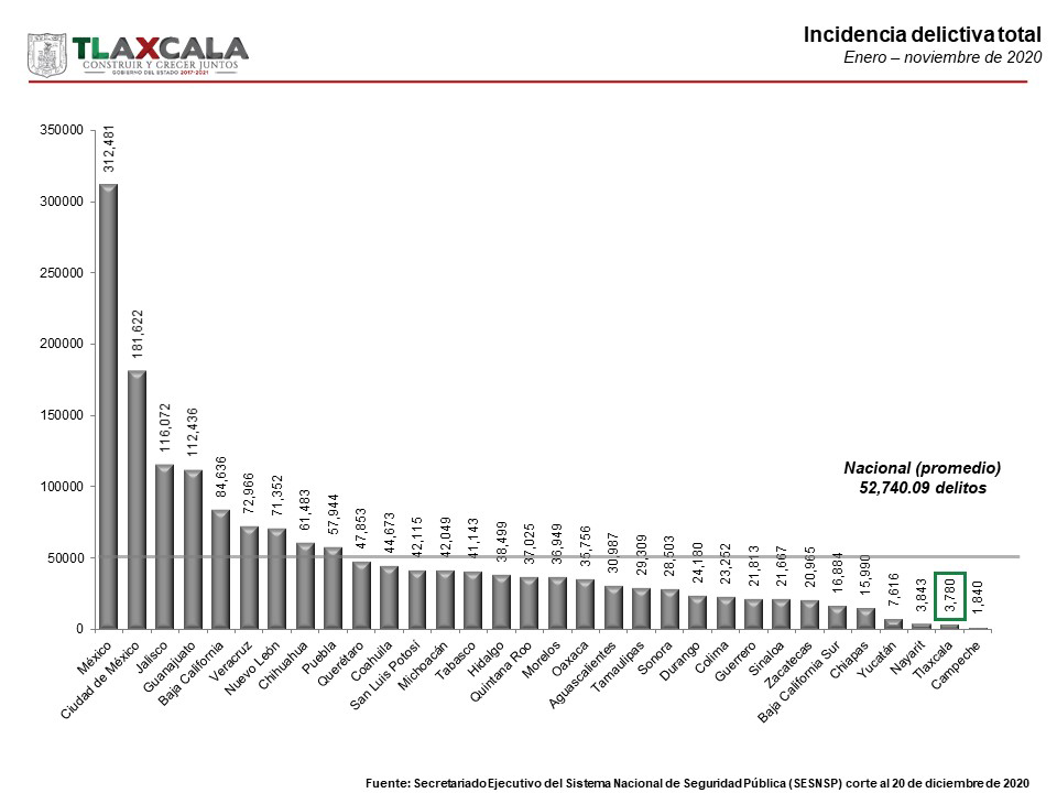 Tlaxcala se consolidó como la segunda entidad a nivel nacional con menor incidencia delictiva, durante el mes de noviembre, tanto en cifras absolutas con tres mil 780 como en tasa por cada 100 mil habitantes con 273.9, de acuerdo con datos publicados por el Secretariado Ejecutivo del Sistema Nacional de Seguridad Pública (Sesnsp).