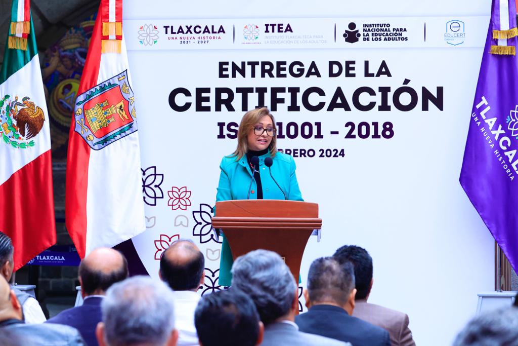 La gobernadora Lorena Cuéllar Cisneros y el Instituto Tlaxcalteca para la Educación de los Adultos (ITEA), recibieron la certificación bajo la norma internacional de calidad ISO 21001:2018, lo que convierte a este dependencia en la primera en todo el país en obtenerlo y pone a la vanguardia a la entidad en el combate al rezago educativo.