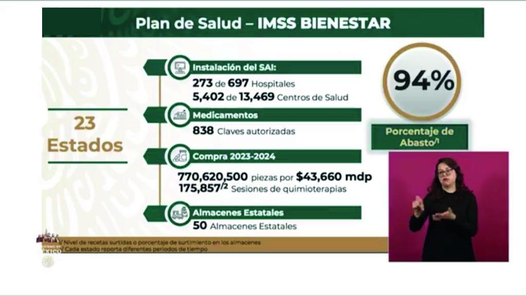 También con el nuevo modelo de salud se han comprado en las 23 entidades 770 millones 620 mil 500 piezas de medicamentos con una inversión de 43 mil 660 millones de pesos, además se han otorgado 175 mil 857 sesiones de quimioterapias y se han identificado los 50 almacenes de medicamentos de los 23 estados del país.