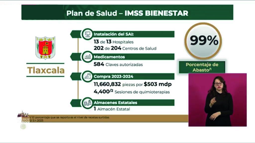 El director general del Instituto Mexicano del Seguro Social (IMSS), Zoé Robledo Aburto, informó que con la operación del Plan de Salud IMSS-Bienestar, en Tlaxcala se adquirieron 11 millones 660 mil 832 piezas de medicamentos con una inversión de 503 millones de pesos, lo que representa un abasto de medicinas gratuitas en recetas surtidas del 99 por ciento en los hospitales de IMSS-Bienestar de la entidad en beneficio de la población que no cuenta con seguridad social.