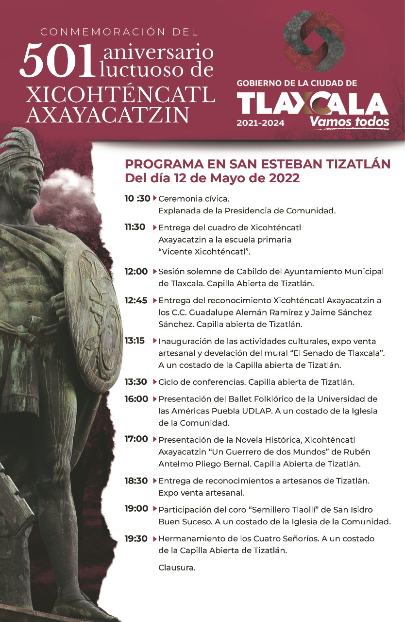 La celebración de la Sesión Solemne de Cabildo en la comunidad de Tizatlán marcará el inicio de la conmemoración, que tendrá muestras de danza, expo-venta artesanal, ciclo de conferencias y la entrega del reconocimiento “Xicohténcatl Axayacatzin” a ciudadanos capitalinos destacados.