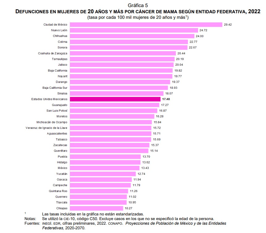 De acuerdo con el Instituto Nacional de Estadística y Geografía (Inegi), la entidad presenta una tasa de 10.95 defunciones por cada 100 mil mujeres, que es significativamente menor a la media nacional de 17.48 defunciones por cada 100 mil mujeres, afirmó el director de Atención Especializada del Sector Salud, Ricardo Rosas Velázquez.