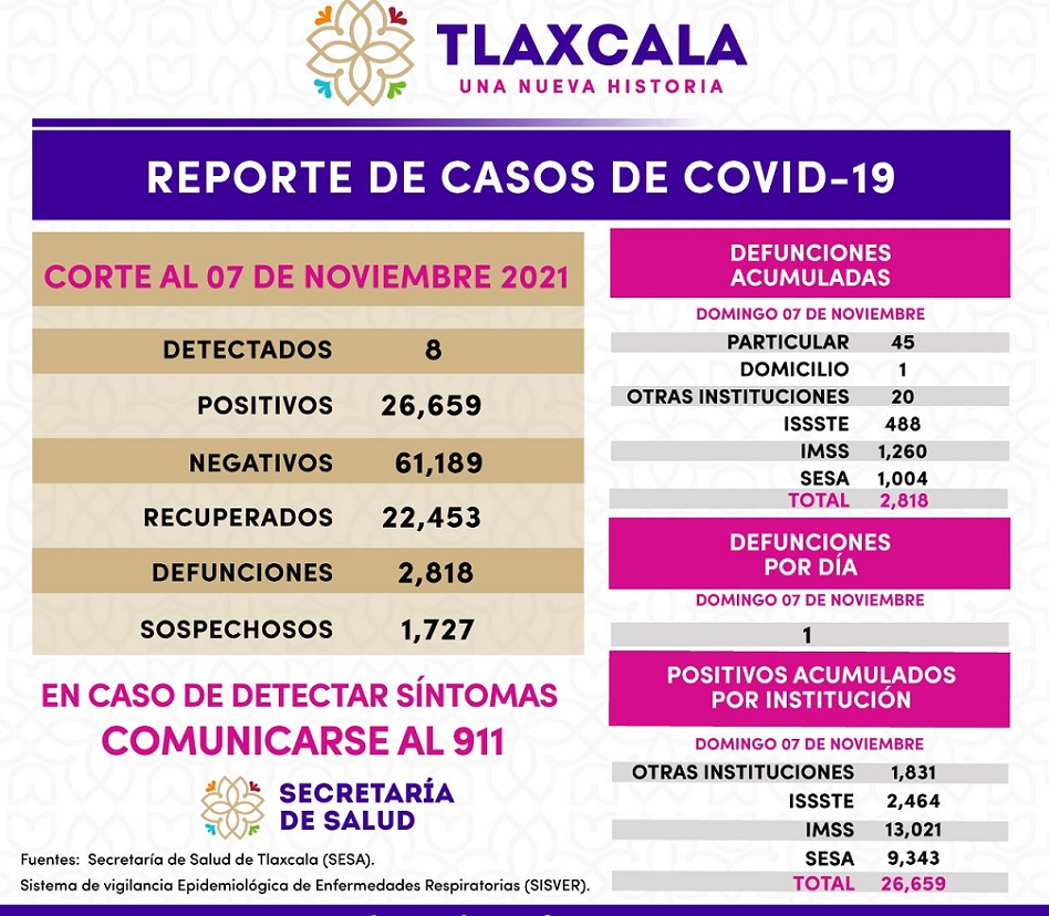 A la fecha, el saldo histórico del estado de Tlaxcala suma los totales de 2 mil 818 defunciones, 26 mil 659 casos positivos y mil 727 casos clasificados como “sospechosos”.