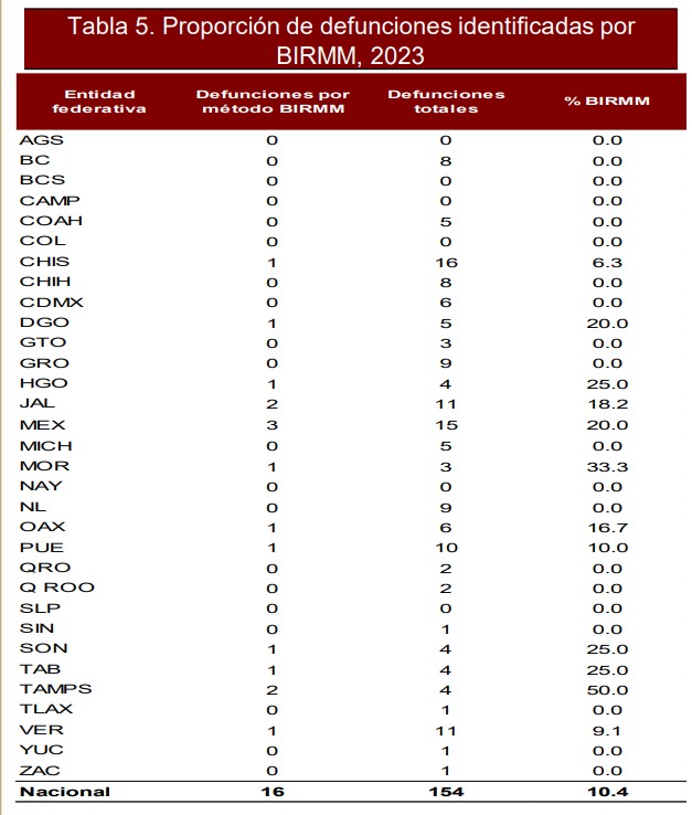 Las entidades federativas que presentan una Razón de Mortalidad Materna (RMM) mayor a la nacional son Hidalgo, Jalisco, Sonora, Veracruz, Coahuila, Oaxaca, Puebla, Tabasco, Morelos, Nuevo León, Chiapas, Chihuahua, Guerrero, Baja California y Durango.