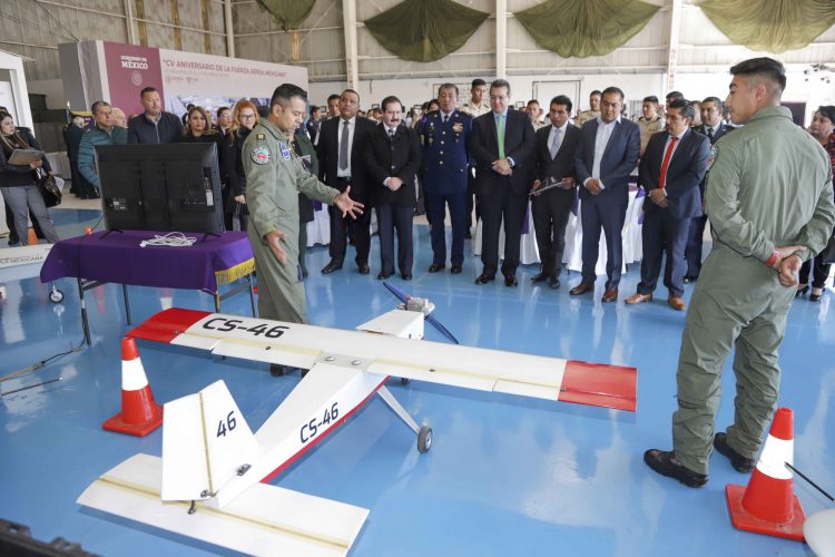 Como parte de la conmemoración del CV Aniversario de la Fuerza Aérea Mexicana, el Gobernador Marco Mena, autoridades militares y funcionarios estatales recorrieron la exposición del equipo de vuelo y aeronaves no tripuladas, instaladas en la Estación Aérea Militar, número 9.
