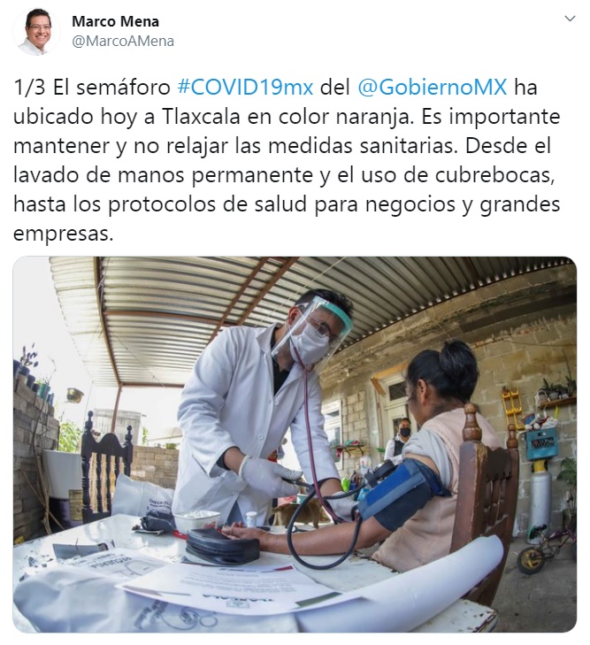 En sus cuentas de Twitter y Facebook, el Gobernador Mena publicó: «1/3 El semáforo #COVID19mx del @GobiernoMX ha ubicado hoy a Tlaxcala en color naranja. Es importante mantener y no relajar las medidas sanitarias. Desde el lavado de manos permanente y el uso de cubrebocas, hasta los protocolos de salud para negocios y grandes empresas.