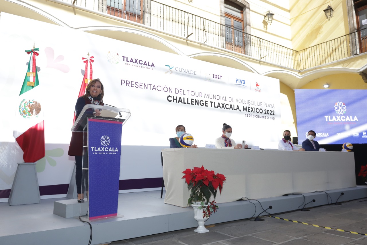 La gobernadora Lorena Cuéllar Cisneros y la directora general de la Comisión Nacional de Cultura Física y Deporte (Conade), Ana Gabriela Guevara Espinoza, anunciaron que el estado de Tlaxcala será sede del Tour Mundial de Voleibol de Playa, «Challenge Tlaxcala, México 2022», a desarrollarse del 17 al 20 de marzo de 2022, en el que se espera la participación de 48 equipos varios países, quienes se disputarán puntos para la clasificación olímpica rumbo a París 2024.