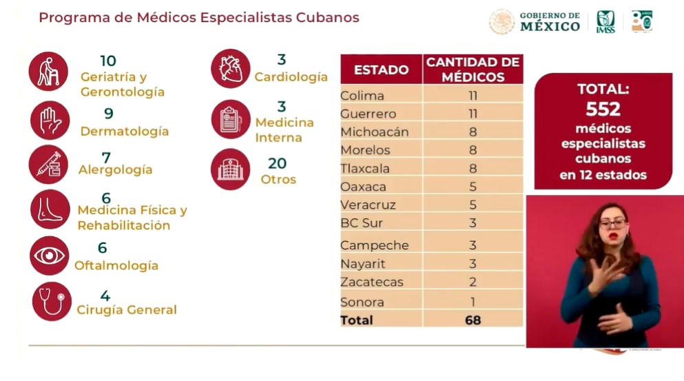 Agregó que de 552 médicos especialistas cubanos que se estarán integrando a los servicios médicos de 12 estados, el viernes 27 de enero arribaron 68 especialistas de los cuales ocho llegaron a Tlaxcala y en los próximos meses se integrarán más a los 10 hospitales IMSS–Bienestar.