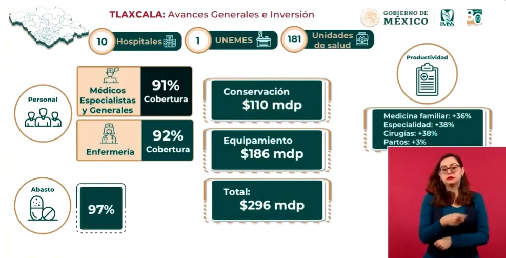 Robledo Aburto señaló que a casi un año de implementado el programa de salud IMSS–Bienestar en los 10 hospitales, 181 Unidades de Salud y una Unidad de Especialidades Médicas (Uneme) de Tlaxcala, los avances generales e inversión es de un 91 por ciento de cobertura de médicos especialistas y generales, 92 por ciento de cobertura en enfermería e históricamente obtener un 97 por ciento de abasto en medicamentos surtidos en las recetas de pacientes.