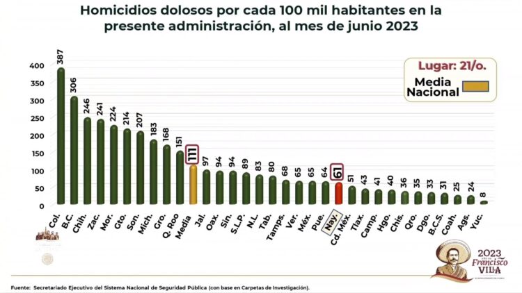 En ese sentido, presentó una gráfica sobre el delito de homicidio doloso por cada 100 mil habitantes, en la que la entidad ocupa el lugar 24 de 32, muy por debajo de la media nacional.