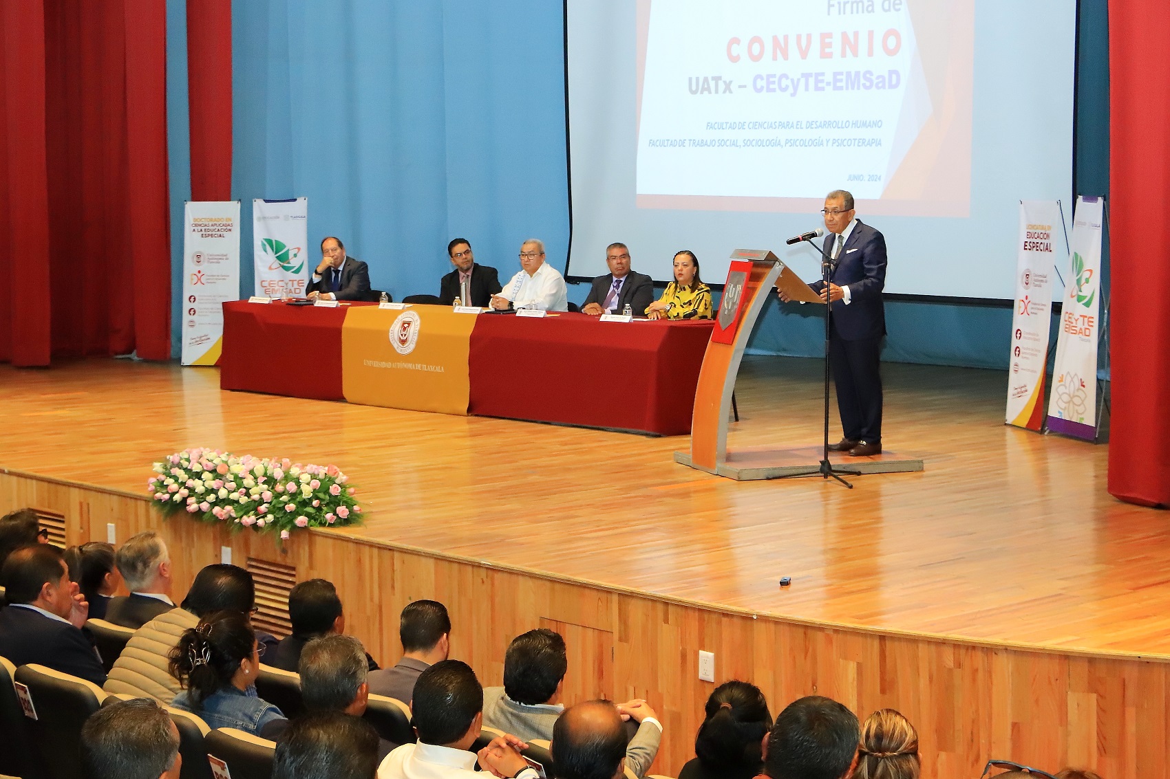 Con el fin de establecer una vinculación relativa a capacitación, así como de asesoría para docentes, estudiantes y padres de familia sobre temas de inclusión, violencia y conductas disruptivas en jóvenes, el Doctor Serafín Ortiz Ortiz, Rector de la Universidad Autónoma de Tlaxcala (UATx), y el Doctor Homero Meneses Hernández, Secretario de Educación Pública del Estado, signaron un convenio marco general de colaboración académica en las instalaciones del Teatro Universitario.