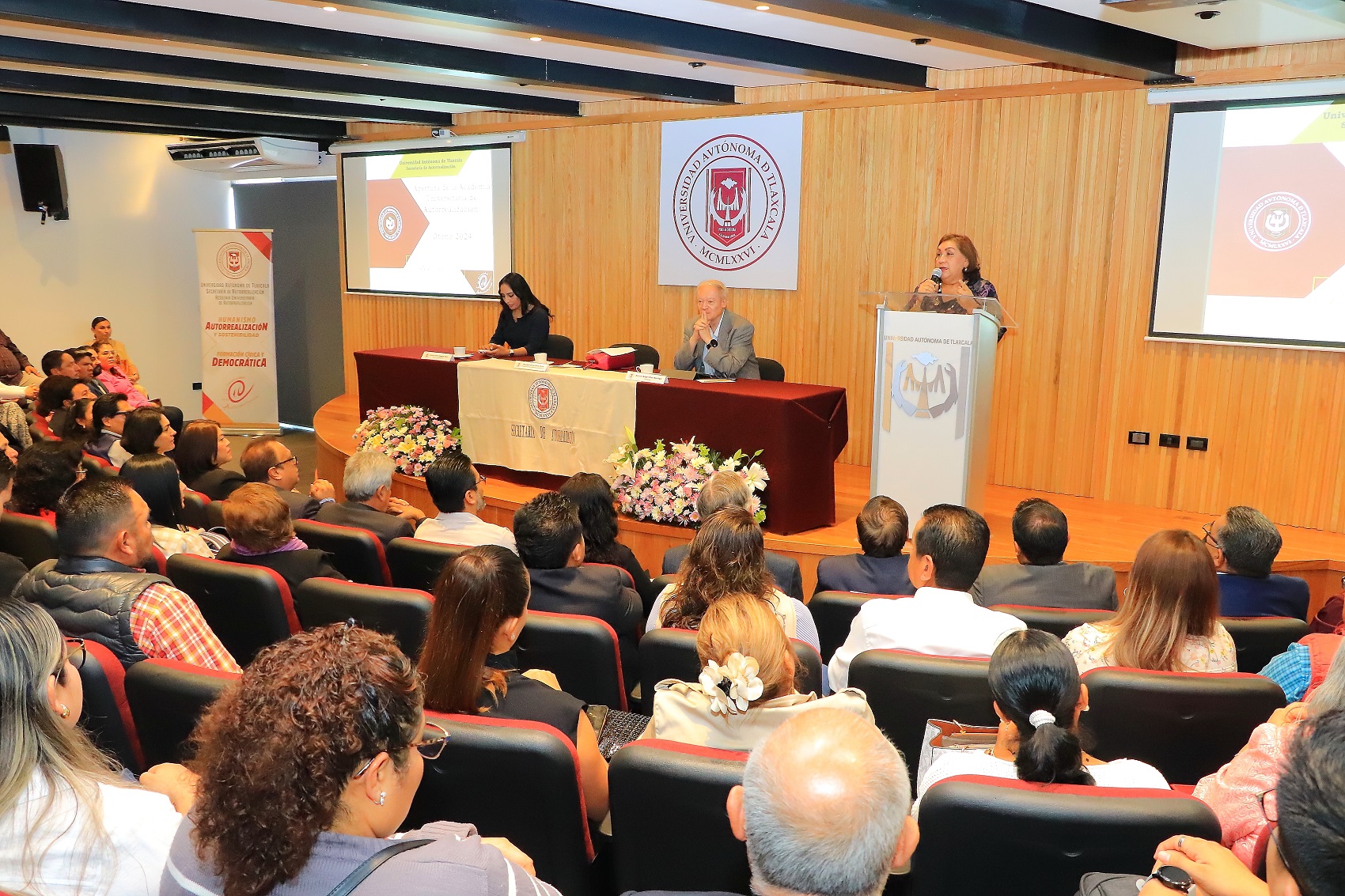 Ante la presencia de los 120 docentes que imparten las unidades de aprendizaje de Humanismo, Autorrealización y Sostenibilidad, así como Formación Cívica y Democrática, la Doctora Elvia Ortiz, Presidenta de la Academia Universitaria de Autorrealización y representante del Rector de la UATx, señaló que este único órgano colegiado se conformó hace más de una década y, sin duda, ha sido el parteaguas para el trabajo académico, además de tener una participación activa en el Modelo Humanista Integrador basado en Capacidades (MHIC).
