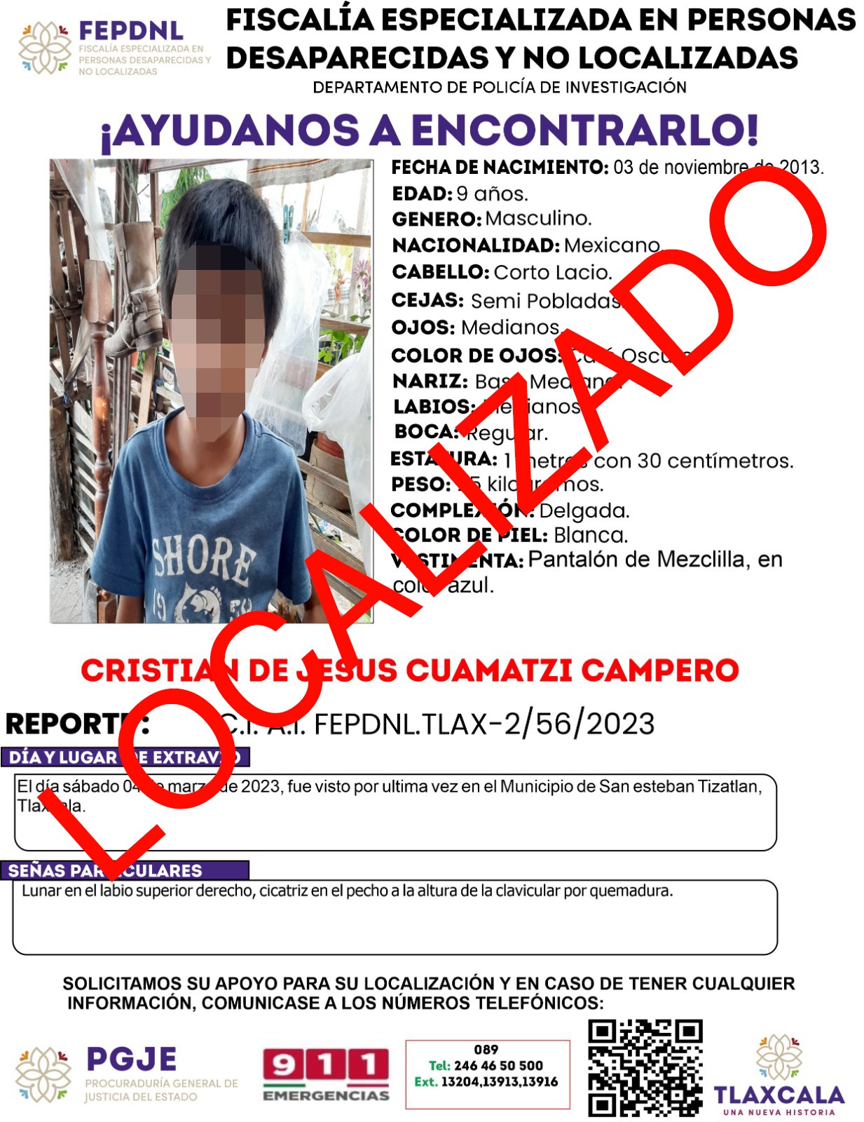Al ejecutar labores de búsqueda y localización por el municipio de Huamantla, elementos de Investigación de la PGJE observaron a una persona con las características fisionómicas del menor desaparecido.
