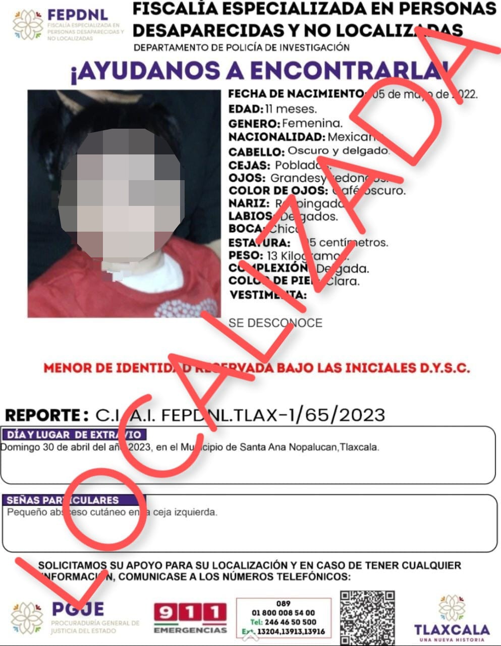 Derivado de la denuncia presentada por familiares de las víctimas, elementos policiacos de la PGJE ejecutaron labores de búsqueda y ubicaron a la mujer quien es menor de edad y a su hija en la localidad de Zitlaltepec, donde les solicitaron que los acompañaran ante el agente del Ministerio Público, ya que existía una denuncia por su desaparición.