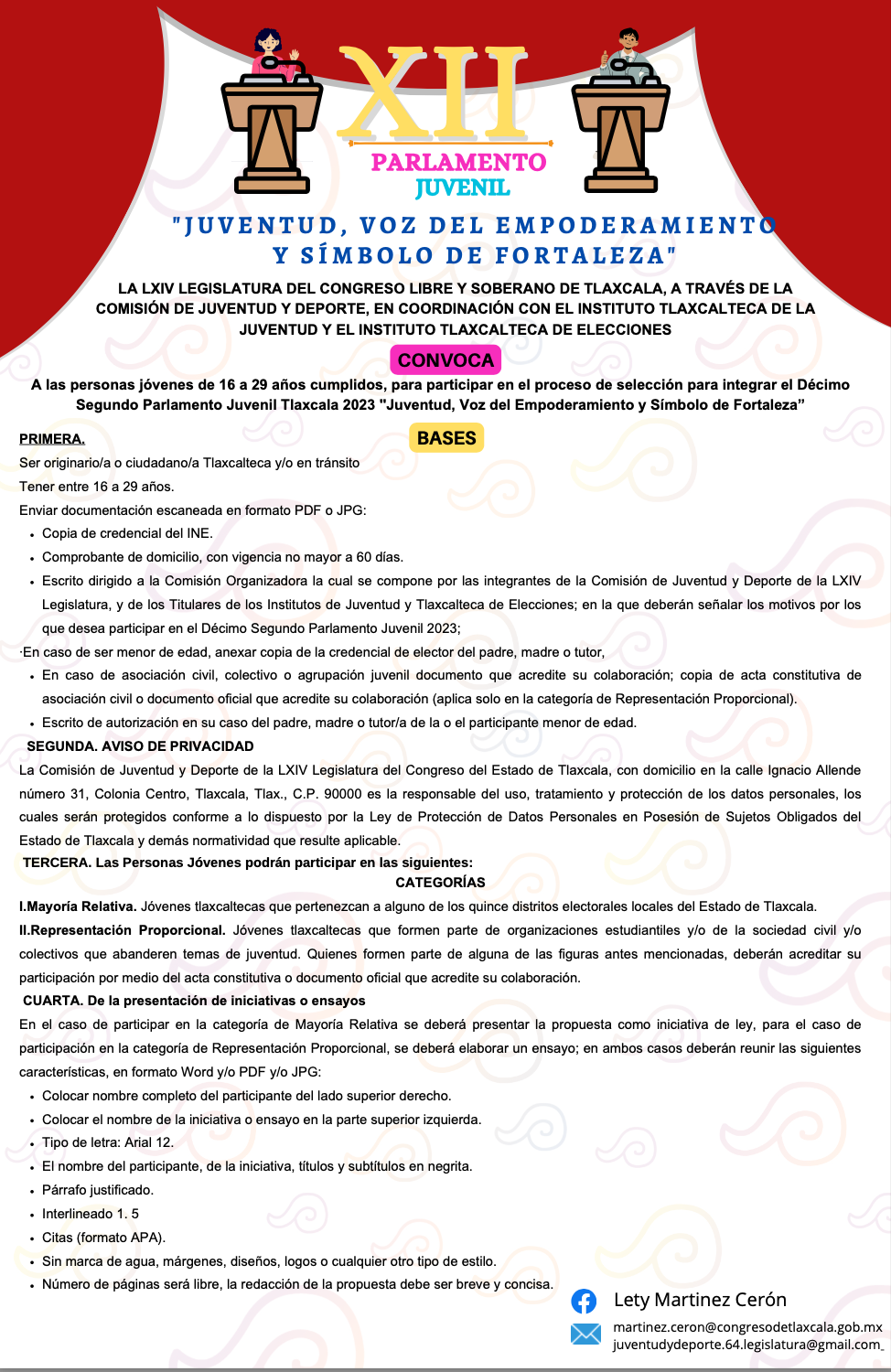 El cierre de la convocatoria es el 31 de mayo, por lo que las y los interesados deberán cubrir los requisitos y presentar su solicitud en las oficinas de la Comisión de Juventud y Deporte, al interior del Congreso del Estado o en los correos martinez.ceron@congresodetlaxcala.gob.mx o