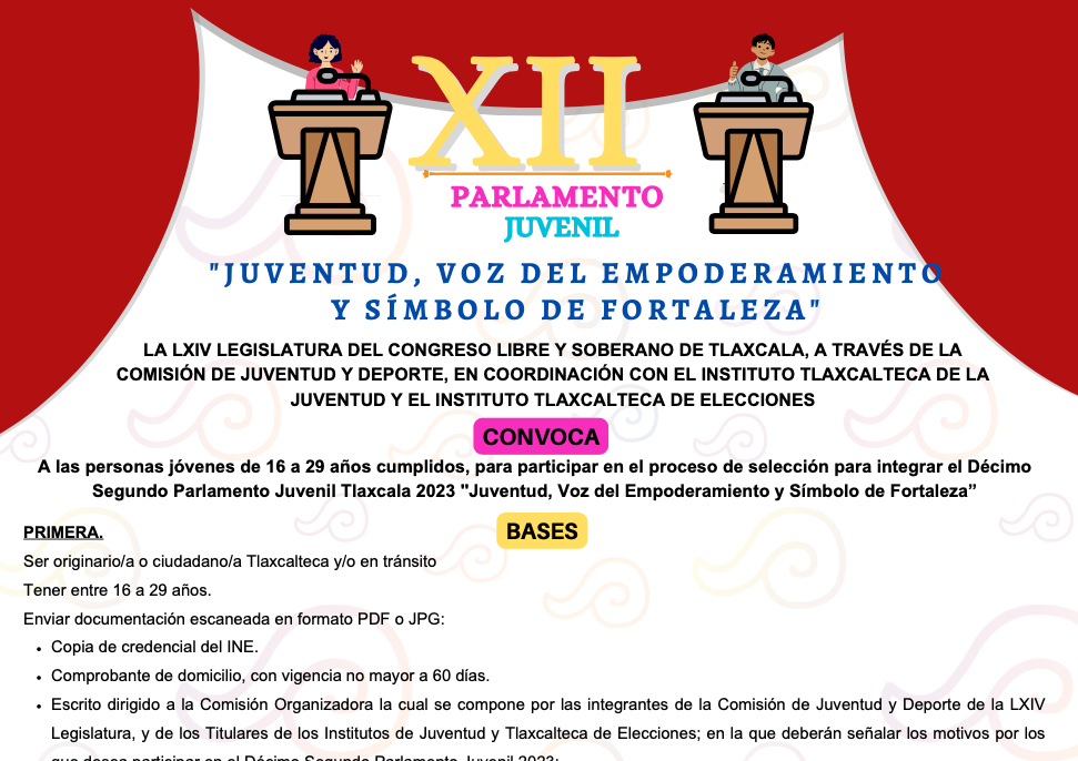 La Comisión de Juventud y Deporte de la LXIV Legislatura del Congreso del Estado, invita a las juventudes tlaxcaltecas a aprovechar estos últimos días de inscripción al XII Parlamento Juvenil «Juventud, Voz del Empoderamiento y Símbolo de Fortaleza».