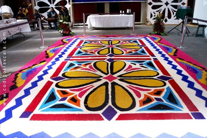 Francisco Montiel, su creador de 19 años, elaboró en menos de tres horas el tapete con arenas pintadas de azul, morado y blanco, y aserrines de rojo naranja y negro, que ocupa el centro del patio. Se compone de motivos florales enmarcados por una fina cenefa de abanico.