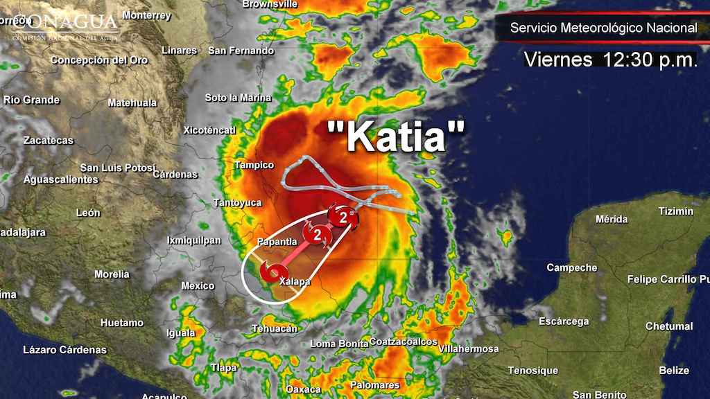 “Katia” evolucionó horas después del sismo a categoría 2 en la escala Saffir-Simpson con rachas de viento en torno a 195 km/h. “Se pronostican tormentas mayores a 250 milímetros en regiones de Veracruz y Puebla, tormentas torrenciales en zonas de San Luis Potosí e Hidalgo, tormentas intensas en localidades de Tlaxcala, Oaxaca, Chiapas y Tabasco, tormentas muy fuertes en áreas de Tamaulipas y el Estado de México y tormentas fuertes en sitios de Querétaro, Ciudad de México y Morelos”, refiere un reporte de CONAGUA datado a las 10:30 hrs de este viernes.Katia está ya frente a Veracruz. (smn.cna.gob.mx)