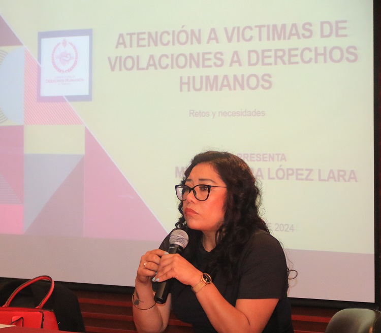 Por su parte, la Maestra Mayra López Lara, Encargada de la Coordinación de Grupos para Atención Prioritaria y Atención a la Sociedad Civil de la Comisión Estatal de Derechos Humanos, disertó sobre 𝗔𝘁𝗲𝗻𝗰𝗶𝗼́𝗻 𝗮 𝘃𝗶́𝗰𝘁𝗶𝗺𝗮𝘀 𝗱𝗲 𝘃𝗶𝗼𝗹𝗮𝗰𝗶𝗼𝗻𝗲𝘀 𝗮 𝗱𝗲𝗿𝗲𝗰𝗵𝗼𝘀 𝗵𝘂𝗺𝗮𝗻𝗼𝘀. Ofreció un panorama de los retos que enfrentan los profesionales en derechos humanos al atender a víctimas, abarcando desde el shock inicial hasta el análisis para una atención específica y el seguimiento de quejas.