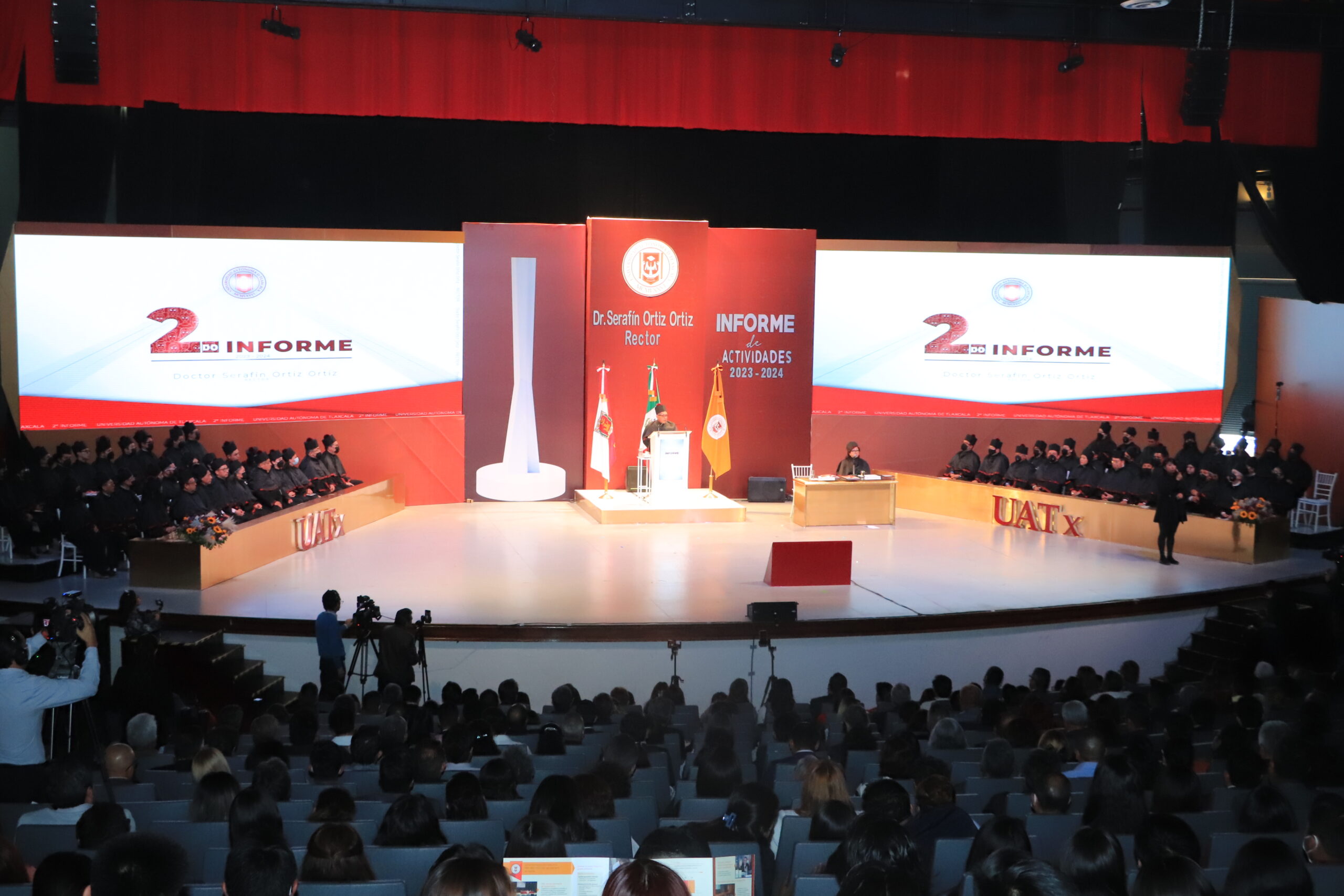 Teniendo como base la normatividad correspondiente, en sesión pública y solemne del Honorable Consejo Universitario, el Doctor Serafín Ortiz Ortiz, Rector de la Universidad Autónoma de Tlaxcala (UATx), presentó su segundo informe anual de actividades y entregó los estados financieros correspondientes al periodo 2023-2024, en ceremonia efectuada en las instalaciones del Centro Cultural Universitario (CCU).